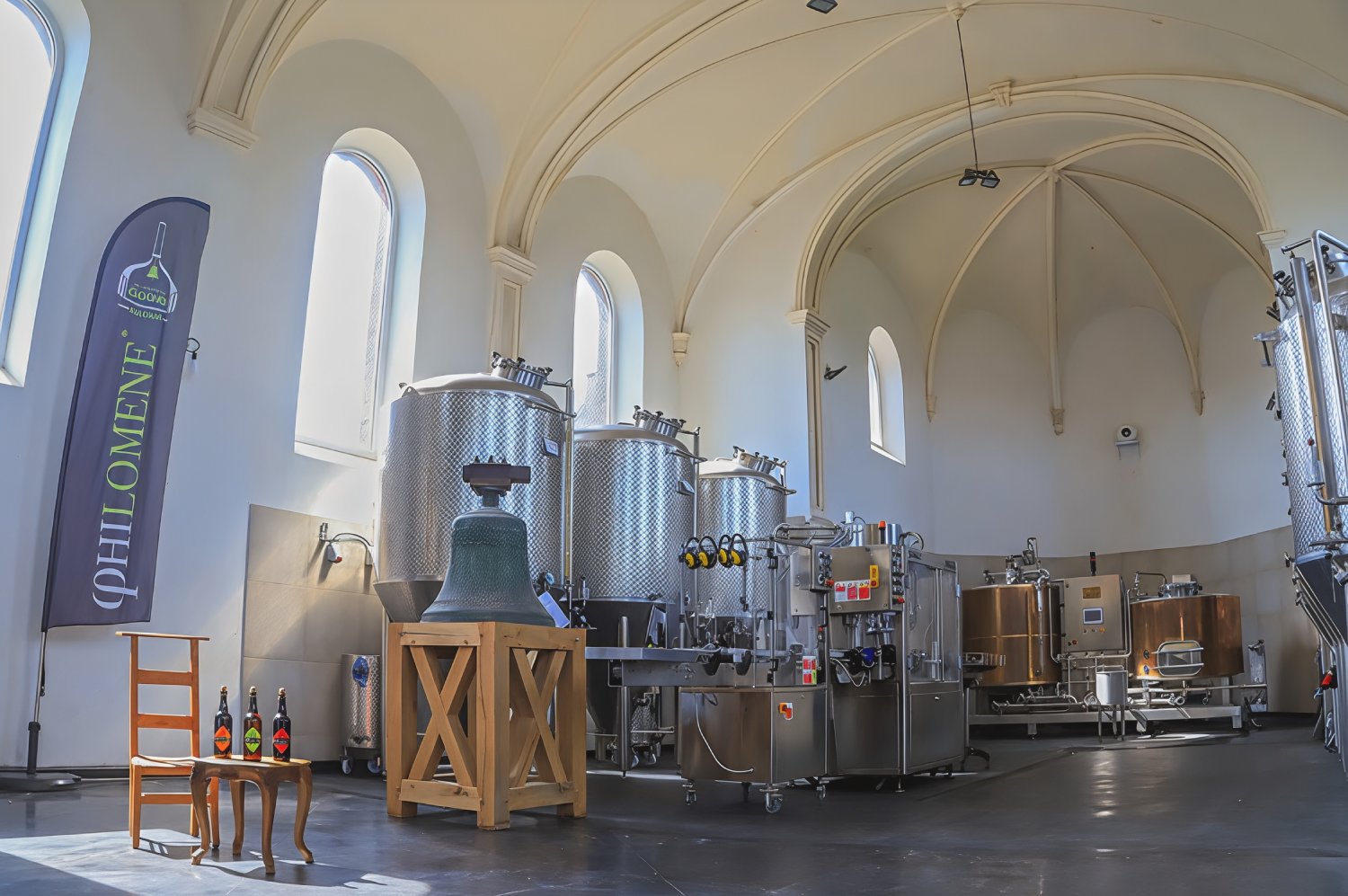 Dès l’origine, l’intention était de brasser de façon autonome et artisanale les bières de la marque « Philomène ». Le bâtiment de l’ancienne église réaffectée accueille aujourd’hui les cuves, l’embouteillage et un comptoir de vente.