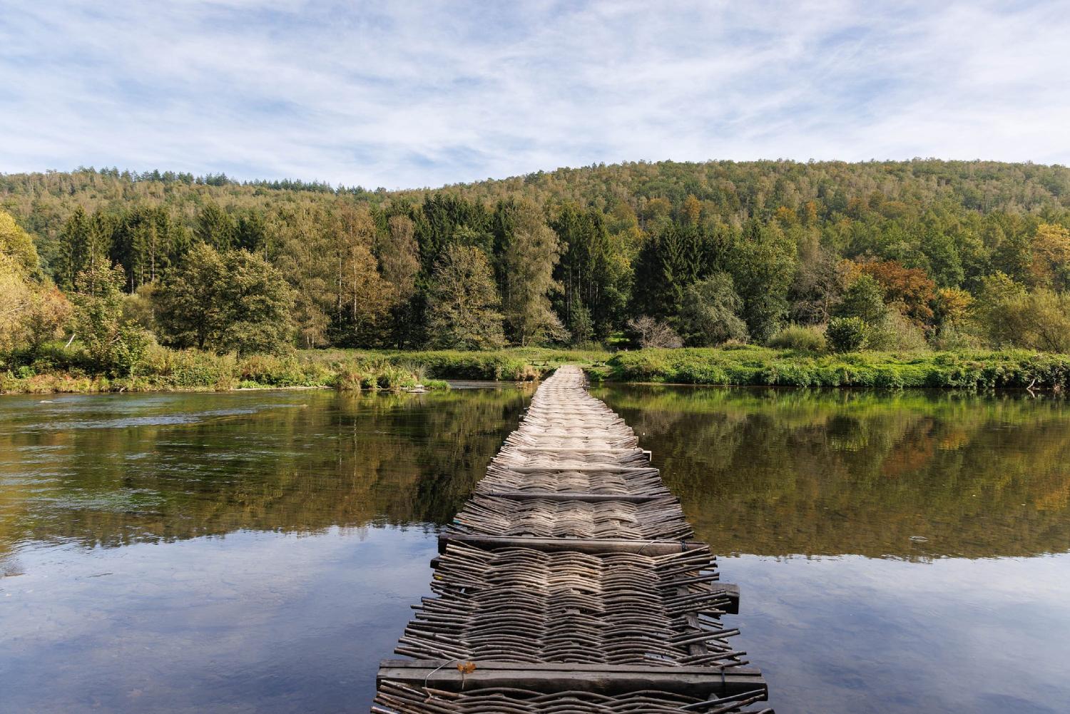 La balade débute à Vresse-sur-Semois, le long de la Rue du Pont. En quelques pas, vous rejoignez la Semois et son célèbre pont de claies (accessible en saison). Cet ouvrage temporaire, installé en été, permet de traverser la rivière à pied en empruntant une passerelle de pieux et claies de bois, héritage d’un savoir-faire traditionnel.