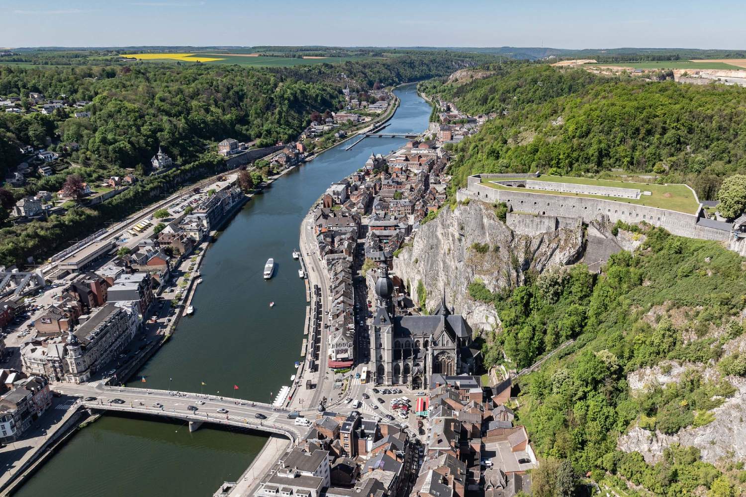 De citadel bereiken kan op verschillende manieren. Wie van een fysieke uitdaging houdt, kan vanuit het centrum de trap van 408 treden nemen die in de rots is uitgehouwen. Een rustiger alternatief is de kabelbaan, die U rechtstreeks van het plein aan de voet van de collegiale kerk naar het bovenplateau brengt. Boven wacht een ruim uitzicht over de stad, de Maas en de beboste hellingen van de vallei. De collegiale kerk en de dicht opeengepakte daken van het centrum vormen samen een herkenbaar beeld van Dinant.